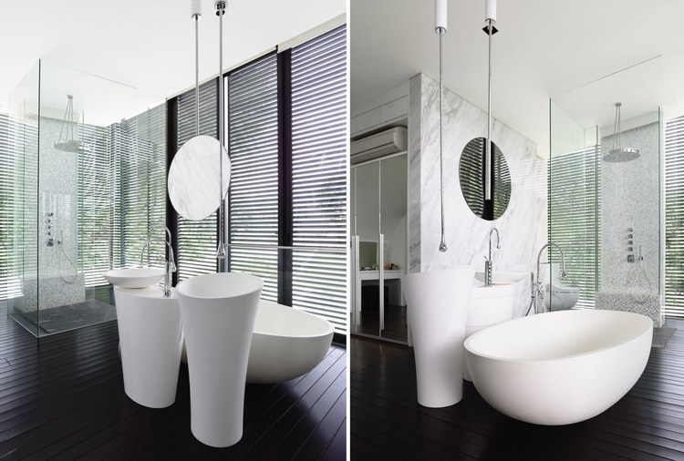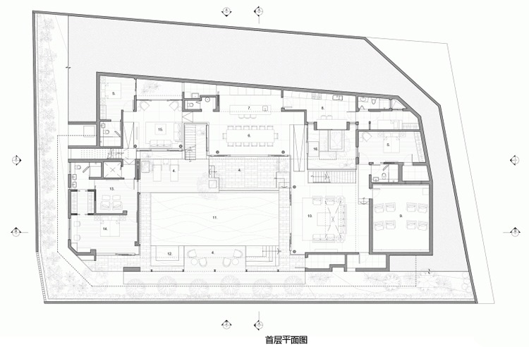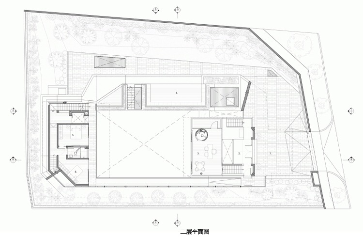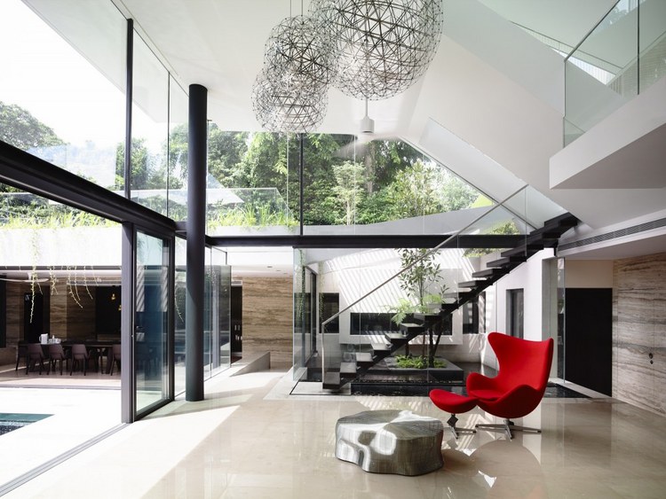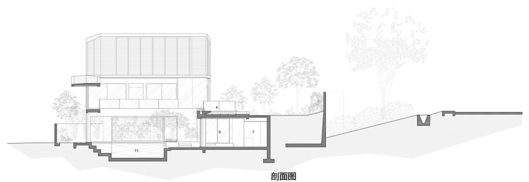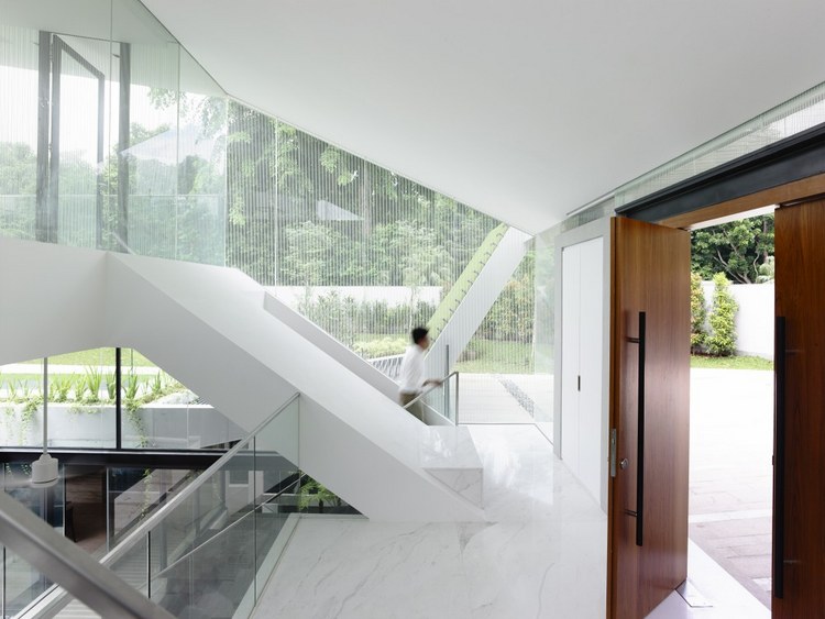 別墅設計安德魯路私人別墅(Andrew Road)設計師將與街面水平的這一層打造為封閉式的樣式,從入口處可以看到中央院落巨大的游泳池,四面各功能房采用了透明玻璃設計,高于街面水平層的二三層樓的屋頂略大于房屋,如鍋蓋一樣將房屋罩在下面。長條式的格柵落地玻璃窗設計與其他部分的設計相呼應,體現(xiàn)了整個別墅簡明的風格樣式。D字型的內部空間設計將房間主要設置在半弧形的位置,過道和樓梯則位于D字形垂直的豎向位置,起到了隔離噪音等作用。